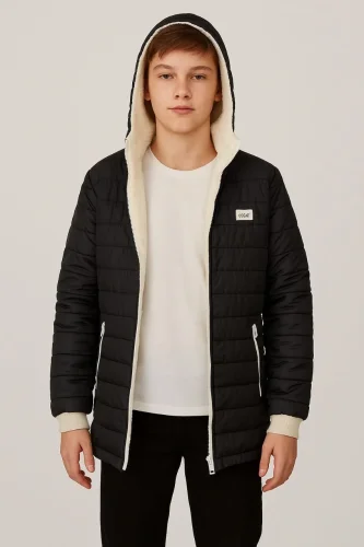 Erkek Çocuk Mont İçi Pelüş Beyaz kürk Astarlı Kapüşonlu Fermuarlı Kışlık Şişme Sıcak Tutucu Mont Siyah