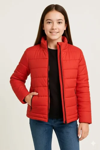 Kız Çocuk Şişme Mont Hafif ve Sıcak Tutucu Kışlık Fermuarlı Su İtici Rahat Günlük Mont Kapüşonuz Modern Tasarım Kırmızı