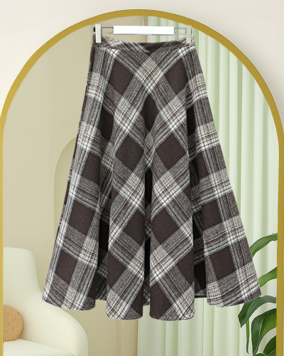 Ekose Desenli Yanı Fermuarlı Kaşe Çan Etek Kahve
