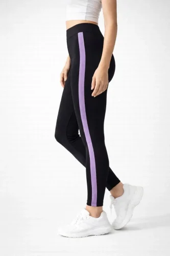 Likralı Yan Lila Şeritli Detaylı Tayt Siyah