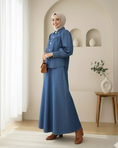 Beli Kemerli Önü Düğmeli Etekli Kot Takım İndigo