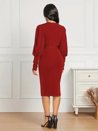 • Kadın uzun kollu bisiklet yaka beli kuşaklı ithal krep midi elbise