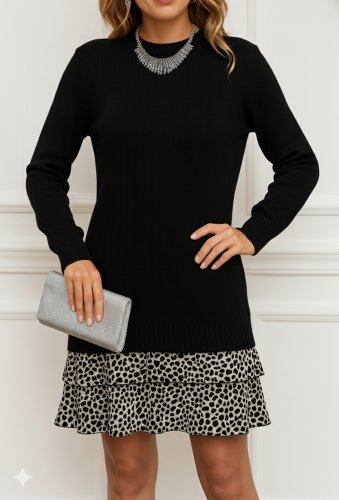 • Kadın uzun kollu üst şardonlu kaşkorse alt süprem desenli elbise
