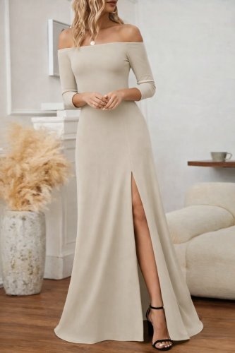 • Kadın uzun kollu madonna yakalı yırtmaç detaylı uzun ithal krep elbise