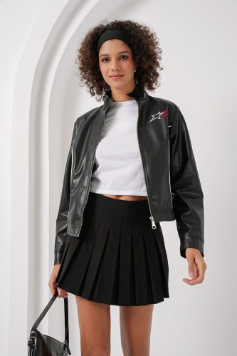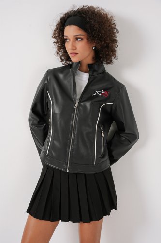• 1041 Dik Yaka Suni Deri Ceket Siyah