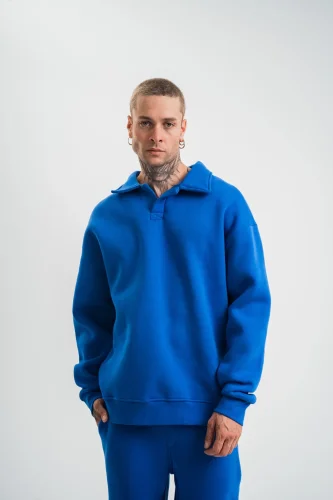 • Erkek Patlı Yaka Üç İplik Pamuklu Sweatshirt Double Oversize Rahat Kalıp Günlük Kullanım Mavi