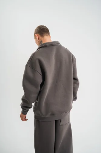 • Erkek Patlı Yaka Üç İplik Pamuklu Sweatshirt Double Oversize Rahat Kalıp Günlük Kullanım Füme