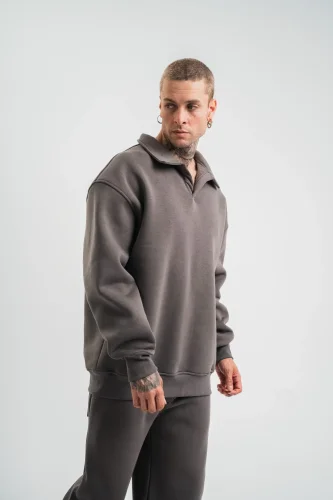 Erkek Patlı Yaka Üç İplik Pamuklu Sweatshirt Double Oversize Rahat Kalıp Günlük Kullanım Füme