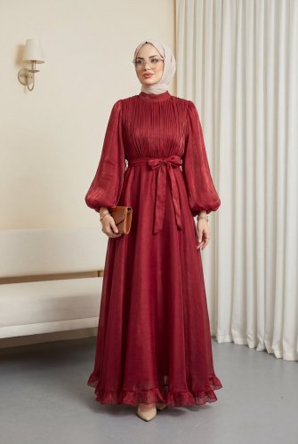 Eteği Volanlı Kemerli Janjan Şifon Elbise Bordo